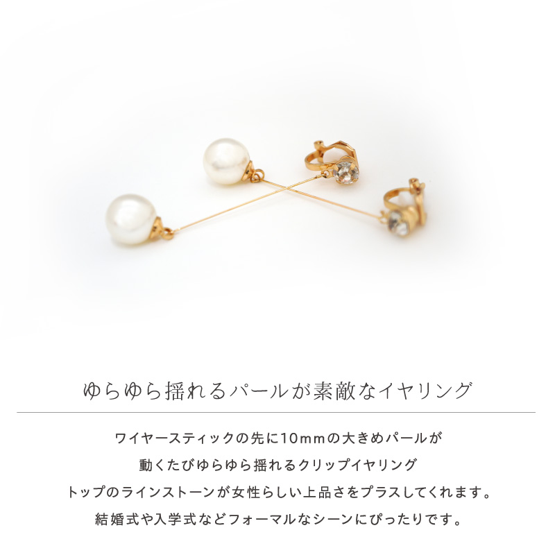 ゆらゆら揺れるパールが素敵なイヤリング カジュアルファッションでも耳元は華やかに♪ ■カラー ホワイト×ゴールド ■サイズ 全長:約5.5cm パール:約1cm ジルコニア:約0.5cm ■規格 亜鉛合金 ■ご注意 モニター環境により若干色が違って見える場合もございますのでご了承下さい