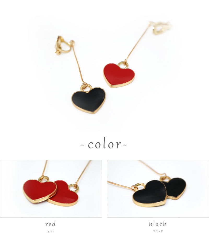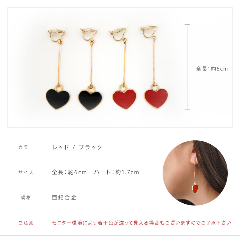 ゆらゆら揺れて可愛いハートモチーフのイヤリング♪ 友達とおソロも◎ ■カラー レッド / ブラック ■サイズ 全長:約6cm モチーフ:約1.7cm ■規格 亜鉛合金 ■ご注意 モニター環境により若干色が違って見える場合もございますのでご了承下さい