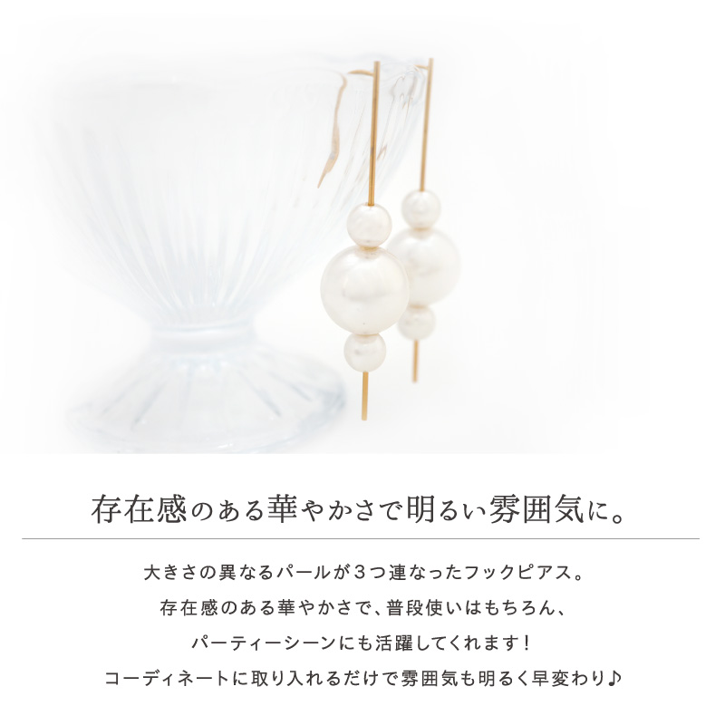 大きさの異なるパールが3つ連なったピアス 存在感のある華やかさで普段使いはもちろん、 パーティーシーンにも活躍してくれます★ コーディネートに取り入れるだけで雰囲気も明るく早変わり!! ■カラー ホワイト×ゴールド ■サイズ 全長:6.5cm パール(大) 1.5cm パール(小) 0.8cm ■個数 2個セット ■規格 亜鉛合金・人造真珠 ■ご注意 モニター環境により若干色が違って見える場合もご […]