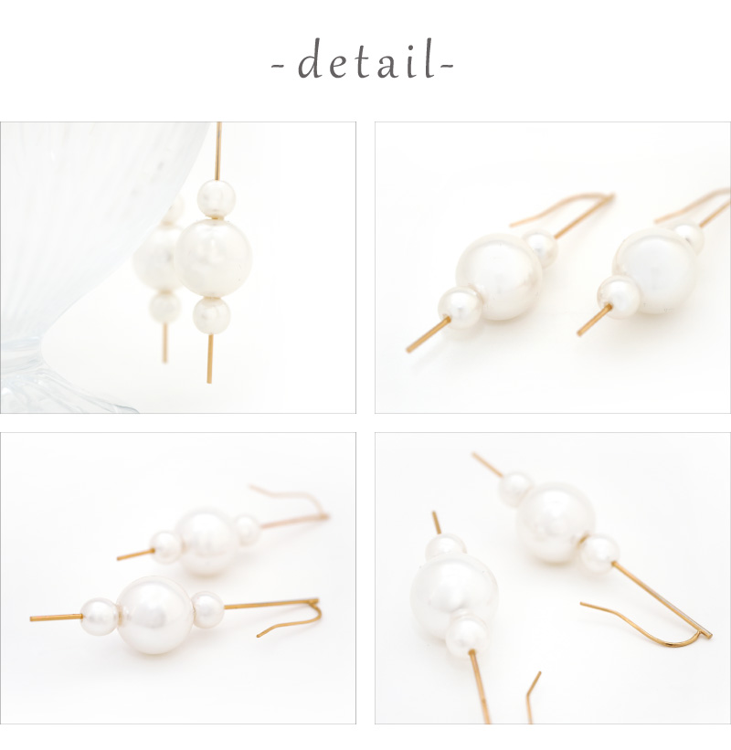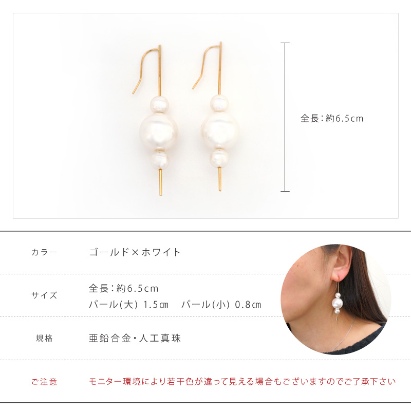 大きさの異なるパールがドロップ状に連なっているのでとてもかわいい☆ 誕生日や記念日、結婚式やパーティにも違和感なく着けられます! ■カラー ホワイト×シルバー ■サイズ 全長:8.5cm ■個数 2個セット ■規格 人造真珠・亜鉛合金 ■ご注意 モニター環境により若干色が違って見える場合もございますのでご了承下さい