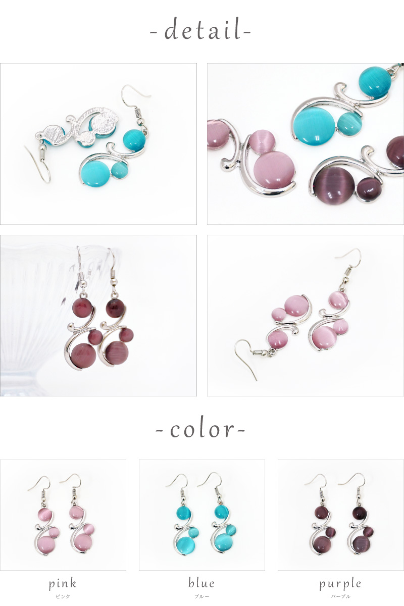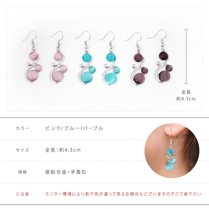 縁のラインがなめらかなので着けている方の雰囲気も穏やかに且つその人らしさがでることでしょう。 ■カラー ピンク/ブルー/パープル ■サイズ 全長:約4.3cm ■規格 亜鉛合金・半貴石 ■ご注意 モニター環境により若干色が違って見える場合もございますのでご了承下さい