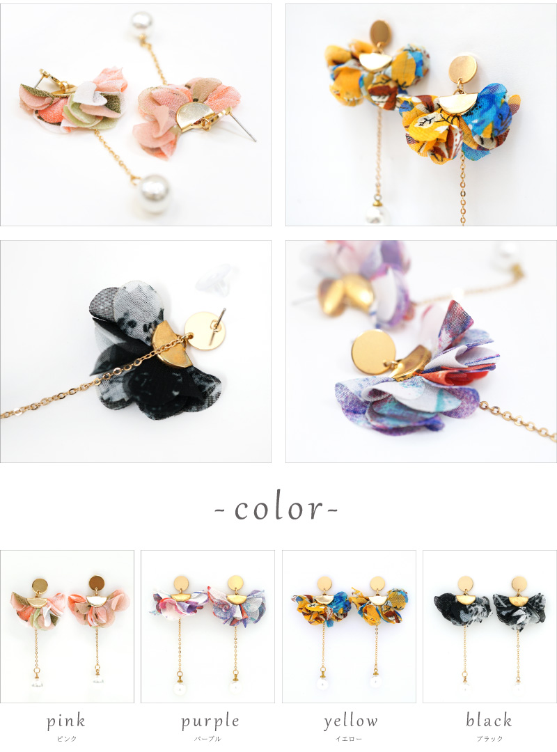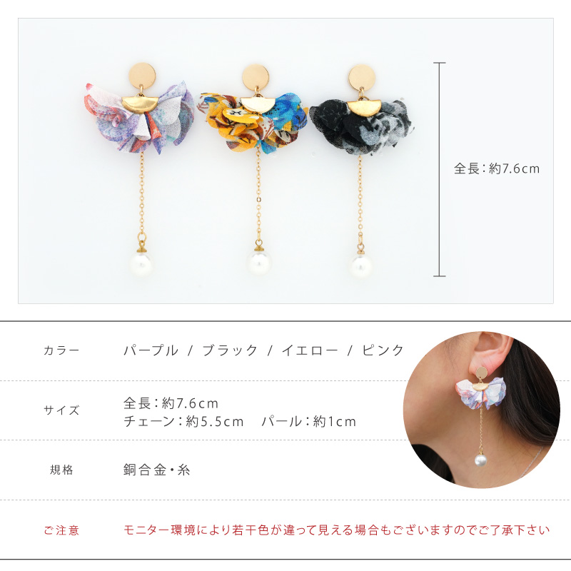 パールがゆらゆら揺れるフラワータッセルピアス♪ お花のタッセルも耳元を華やかに ■カラー パープル / ブラック / イエロー / ピンク ■サイズ 全長:約7.6cm チェーン:約5.5cm パール:約1cm ■規格 銅合金・糸 ■ご注意 モニター環境により若干色が違って見える場合もございますのでご了承下さい