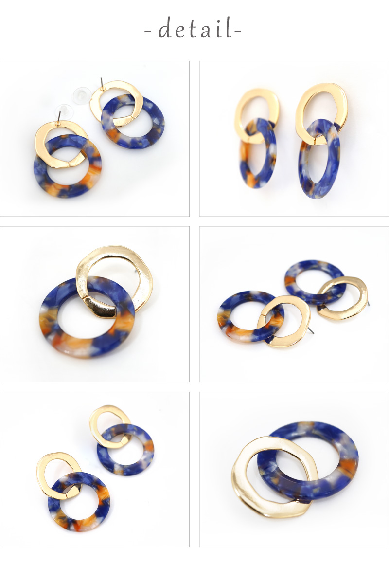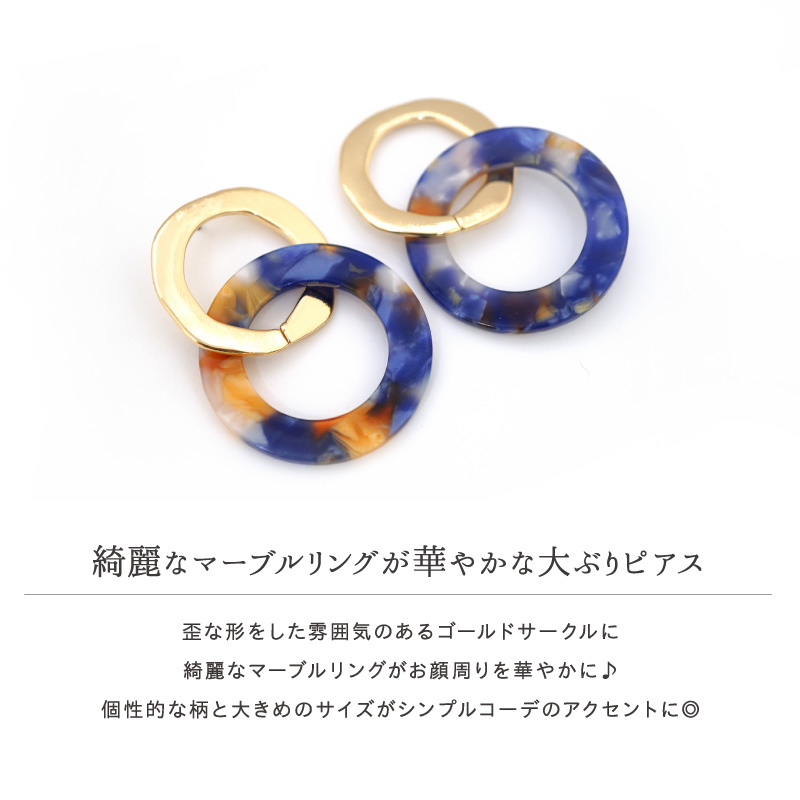 『ラウンドひょう柄ゴールドピアス』大ぶり べっ甲風 サークル リング ゴールド ブルー イエロー マーブル