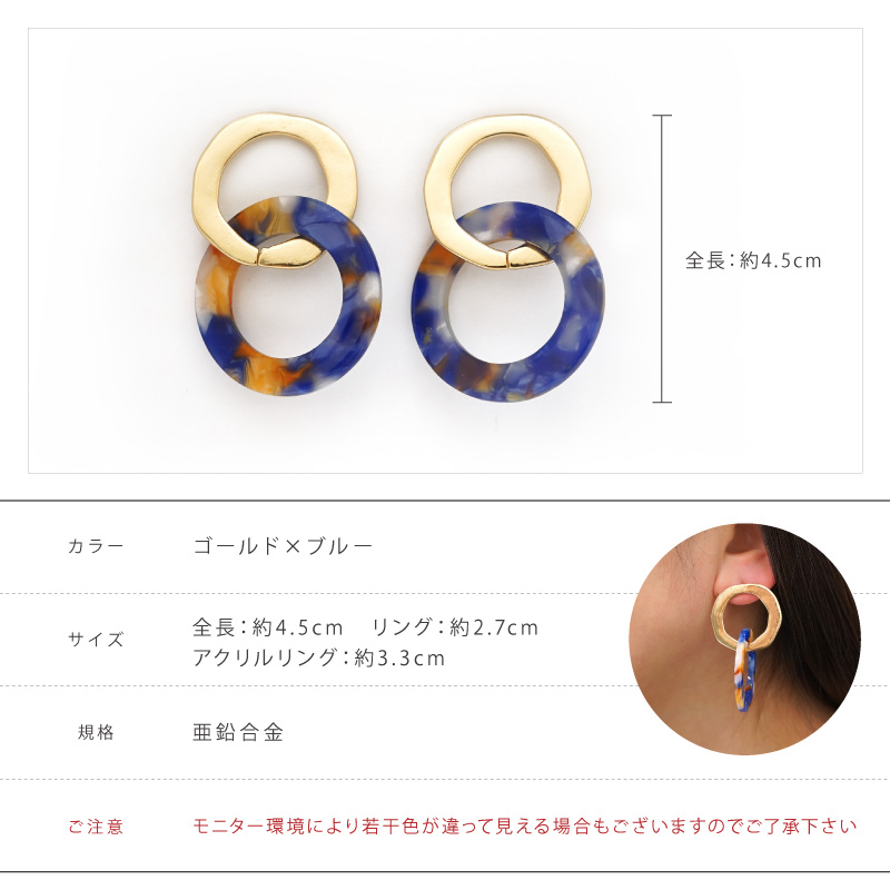 ヒョウ柄とゴールドの最高の組み合わせ! 綺麗なブルーとブラウンが耳元の存在感をUPさせてくれます。 ■カラー ゴールド×ブルー ■サイズ 全長:約4.5cm リング:約2.7cm アクリルリング:約3.3cm ■個数 2個セット ■規格 亜鉛合金 ■ご注意 モニター環境により若干色が違って見える場合もございますのでご了承下さい
