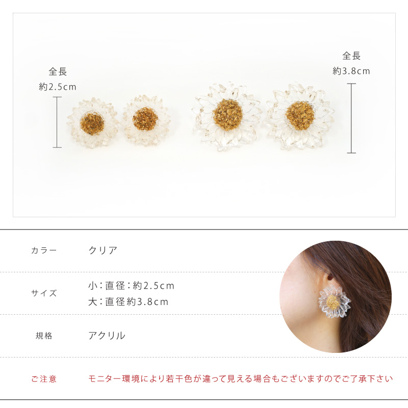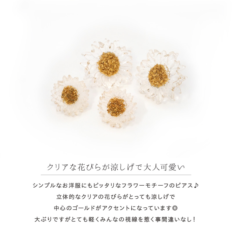 シンプルなお洋服にもピッタリでクリアがとても涼し気なフラワーピアスです☆ 大ぶりですがとても軽くみんなの視線を惹く事間違いなし! ■カラー ゴールド ■サイズ 全長:約3.8cm ■規格 アクリル ■ご注意 モニター環境により若干色が違って見える場合もございますのでご了承下さい
