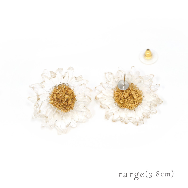 シンプルなお洋服にもピッタリでクリアがとても涼し気なフラワーピアスです☆ 大ぶりですがとても軽くみんなの視線を惹く事間違いなし! ■カラー ゴールド ■サイズ 全長:約3.8cm ■規格 アクリル ■ご注意 モニター環境により若干色が違って見える場合もございますのでご了承下さい