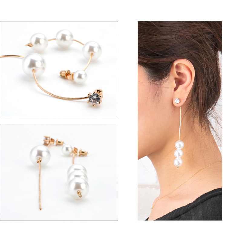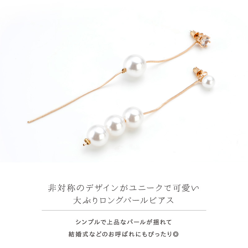 非対称のデザインがユニークで可愛いパールのロングピアスです。