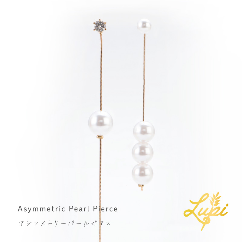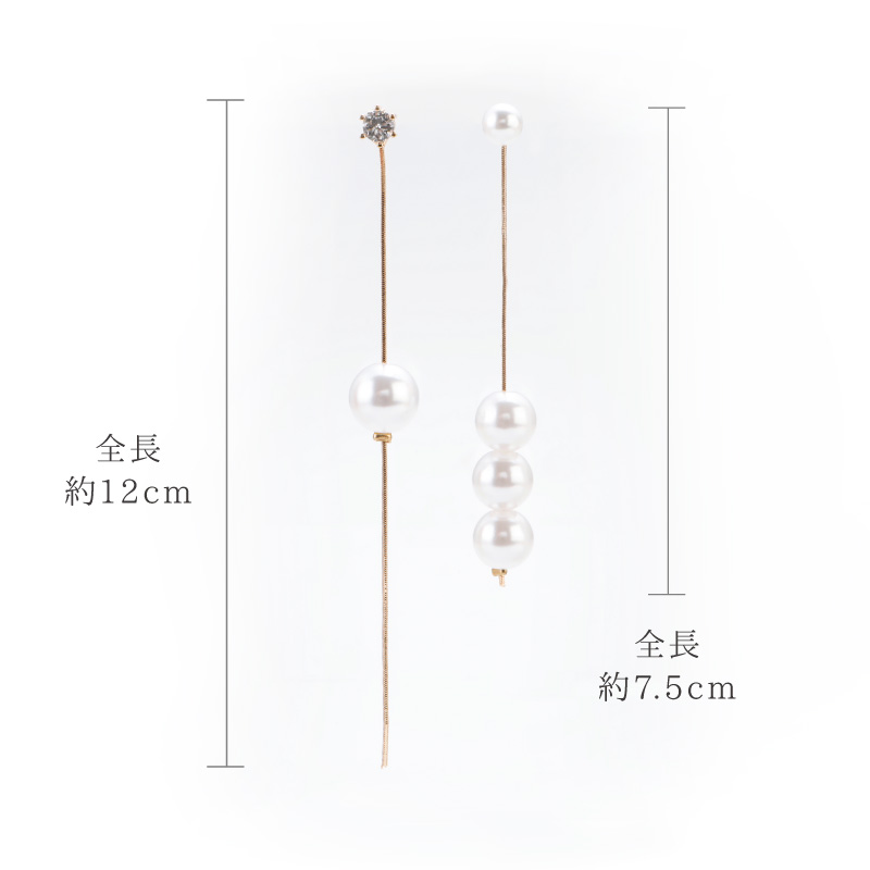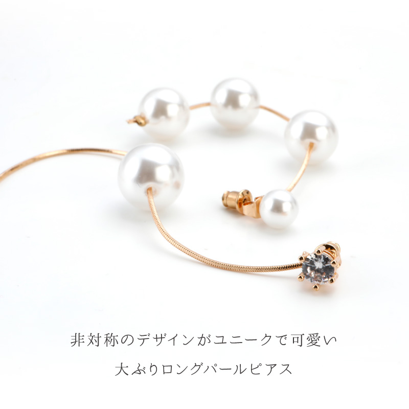 非対称のデザインがユニークで可愛いパールのロングピアスです。